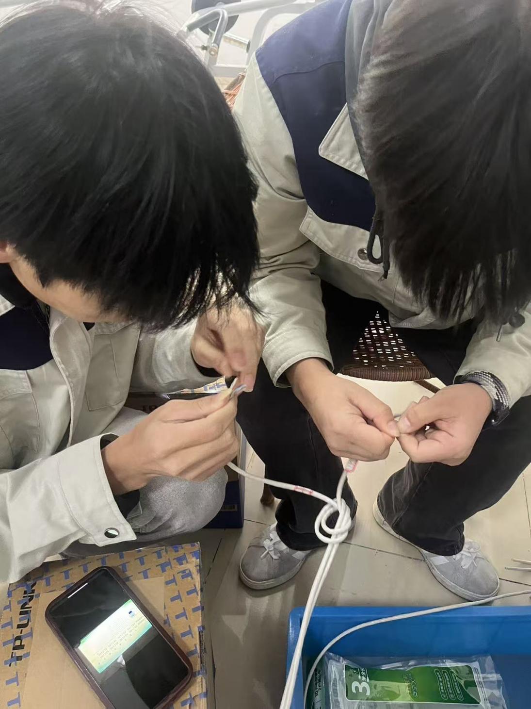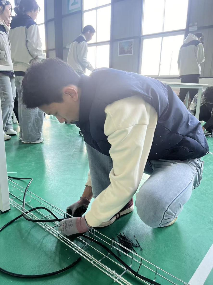 电气装置集训队在王州老师的指导下,承担了赛场供电系统的建设任务。同学们首先进行现场勘查,科学规划电源分布方案,随后展开配电的安装与接线工作。在强电施工过程中,严格按照安全规范操作,精准完成线路敷设、设备连接等工序,确保供电系统的稳定可靠。这一实战经历,让同学们将在训练中掌握的电气安装、系统调试等技能得到了充分应用和提升。